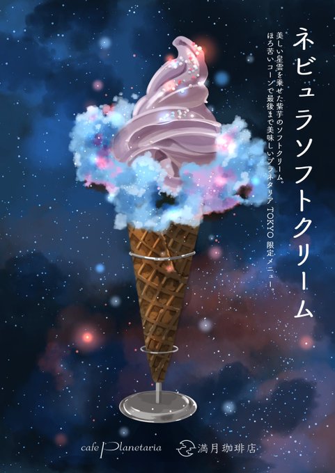 1月4日からのプラネタリアさんとのコラボですが有楽町のお店では前回描き下ろしさせていただいた4つのメニューが再びお召し上がりいただけますー☺️✨満月珈琲店の星詠み⑤で登場する「無重力ソーダ」「銀河のカッサータ」もぜひ味わってくださいー✨✨