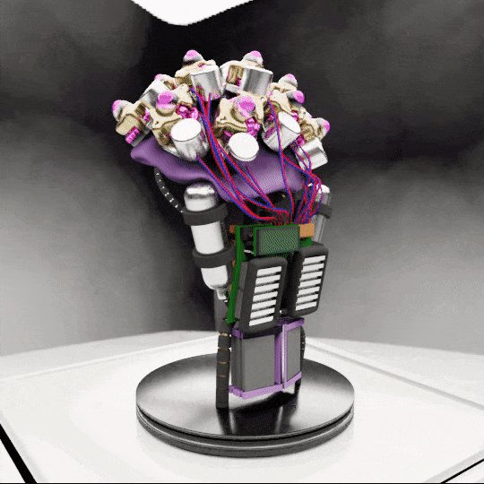13 linear actuators (20mm stroke), two compressed air cans and on board control system, which inflate and deflate the glove instantly. Six batteries provide the power, two large Al heat-sinks for the motor drivers, a lcd screen display and custom Halloween paint.