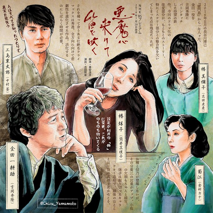 BSプレミアム『悪魔が来りて笛を吹く』を描きました! いろいろあるけど、あのクライマックス、あのひとことは圧巻の説得力。 #悪魔が来りて笛を吹く #横溝正史 #金田一耕助 #吉岡秀隆 #BSプレミアム #横溝絵 #金田一絵 #横溝美術部