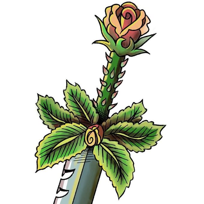 A lovely client asked me for a prop art of her dnd character and her character's weapon, a special serrated rosebud blade made with thorns in the handle so her devout character would always bleed when she caused harm. Metal as hell. I loved drawing this!!