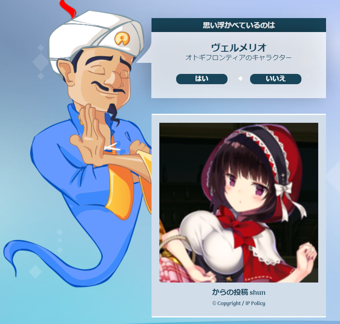 アキネーターに勝ちました。 頭巾が出てくるとは…(想像していたキャラとは違う)。
