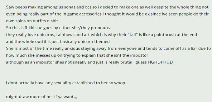 Decided to make my own among us oc,, yeah the design is definietly not done with the in game stuff,, just my own spin on it,, second photo is a slightly rough description from my DA #amongus #amongusfanart #AmongUsSona