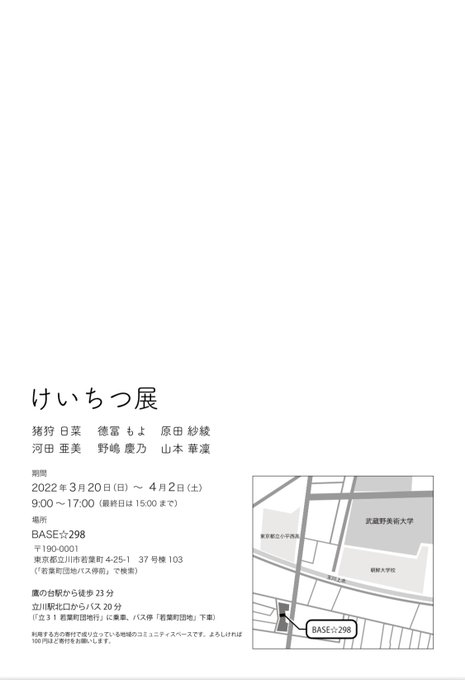 武蔵野美術大学彫刻学科5人と版画学科1人で展示やります〜! 場所は大学の裏、若葉町団地バス停前のコミュニティスペースです🐰 ほぼ毎日在廊予定なのでいつでも来てください!