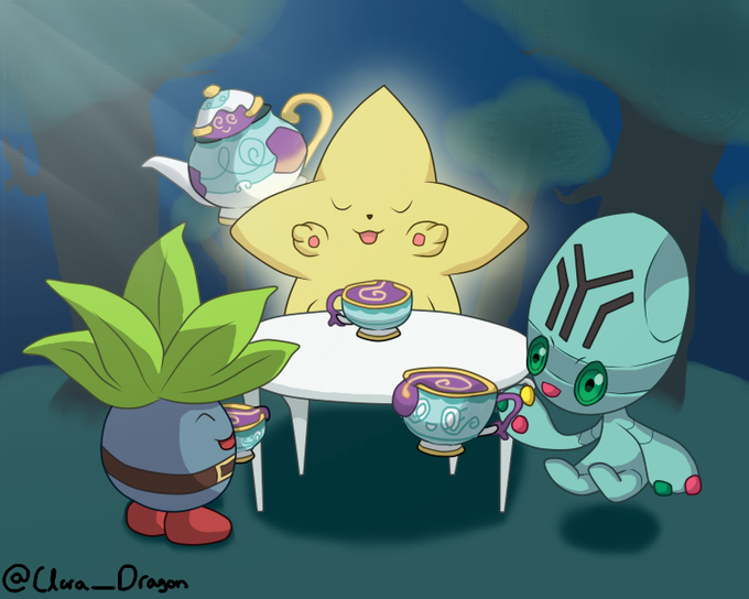 Bueno os dejo un pequeño fanart que he estado haciendo una hipotetica reunión tomando el té entre Odette de @diariodeodette, Elgyem de @pkmn_realidea y Cometry a la que ya conocéis del perseida ^^