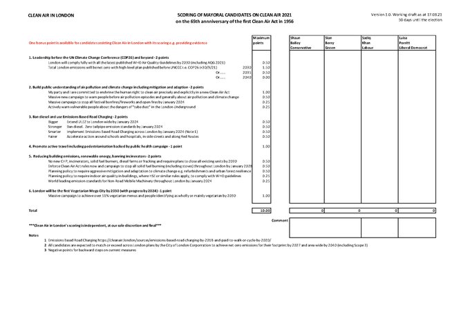 #Mayor4CleanAir scorecard. My personal favourite: Make London the first #VegetarianMegaCity by 2030 cc @carriesymonds @SadiqKhan @sianberry @ShaunBaileyUK @LuisaPorritt @LondonLibDems @LdnConservative @LonGreenParty @LondonLabour (with huge thanks to the talented @DaveyCartoons)