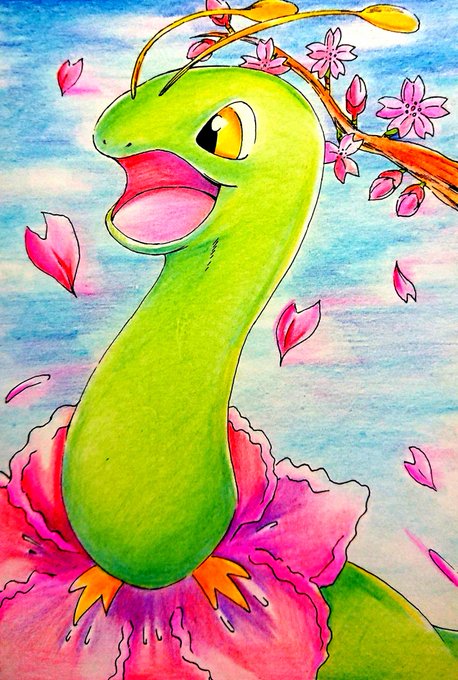 メガニウム × 桜 咲いた!咲いた!🌸 #メガニウム #ポケモン #イラスト #桜 #絵 #かわいい