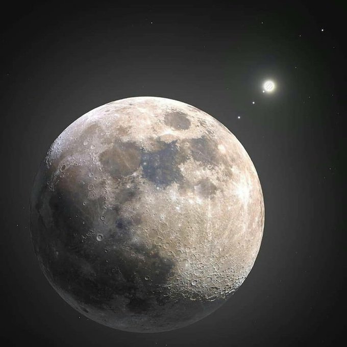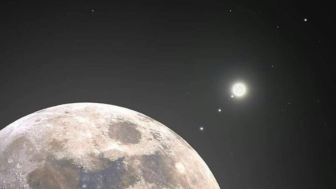 Esta é uma imagem composta da Lua e Júpiter. As luas Galileanas (da esquerda para a direita) são: Ganimedes, Europa, Io e Calisto. Bora subir? postem "LUA E JÚPITER"