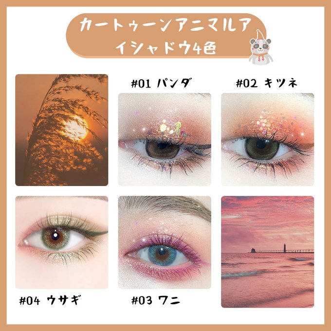 😘動物の絵柄が可愛くて、小柄で持ち運びが便利。4つの色味が展開され、大粒のグリッターでツヤめく目元に!