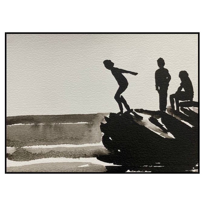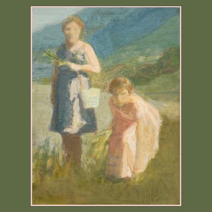 This piece by Norman features his beautifully pastel colour palette of high vibrational hues. Ribbons of sunlight seem to glisten between figures and their background.
