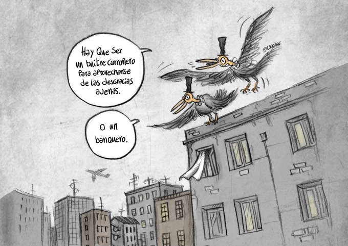 Buitres carroñeros en franco contubernio que destrozan al pueblo: los politiqueros y la banca. Caricatura de @Elkokoparrilla