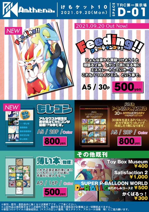 【告知】【9/20(mon) けもケット10】【スペース:D-01/Amthena.】お品書きです!今回も状況が状況なので、イベント運営元の感染対策に従った上でご購入の方をよろしくお願いします。新刊の詳細→https://t.co/C69O4vowoF