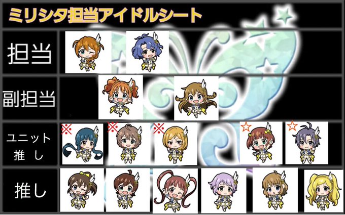 ミリシタ担当アイドルシート改定したので デレミリのアイドル事情を載せますねー! ※5luxury(4luxury+莉緒姉)はいいぞ... ☆ASは尊いぞ... 中でもこの2人+やよいに弱いぞ...