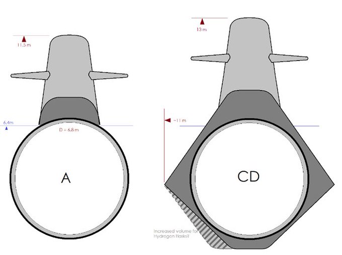 New workings, type-212CD (related: https://t.co/bNLBA2FNOH ) submarine for Germany and Norway will feature angled outer hull for added stealth. Sketch based on public dimensions