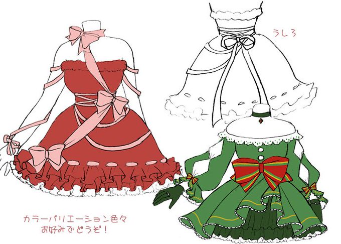 プレゼントボックスをイメージしたリボンのドレスと、クリスマスカラーのふんわりドレスです。