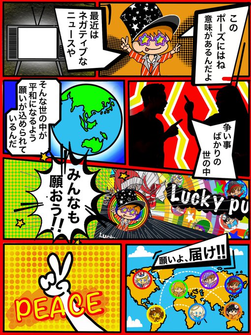 ピースの格好は平和を表しており、世の中が平和(ピース)になるように願いがこめられております。