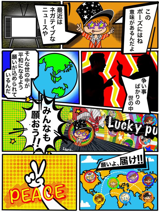 ピースの格好は平和を表しており、世の中が平和(ピース)になるように願いがこめられております😁