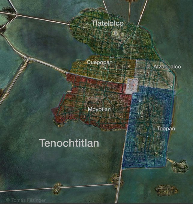 REALIDAD: Las 4 parcialidades que se ven en realidad no eran barrios. En Tenochtitlán existieron entre 48 y 53 barrios de acuerdo con la investigadora Barbara Mundy. Imagen T. Filsinger