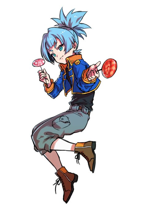 "Hello there, insect girl~!" A blue-haired boy says