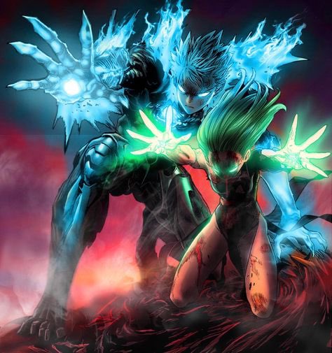 Tatsumaki and Genos work together fighting psykos