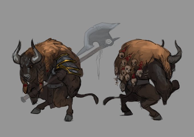 Here is an unfinished design sketch of a Minotaur brute I did randomly.Dont have the time to finish but want to share him. He is an executioner. He wears the skulls of his prey as trophy on the back of his long hair. A kind guy. Also, and OLD sketch from last year.
