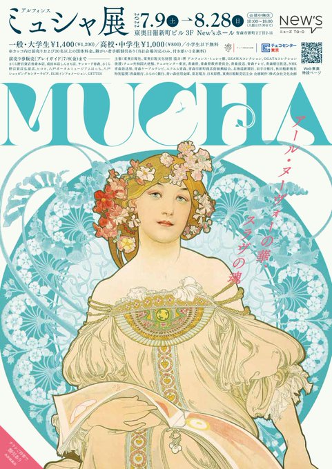7/9(土)より青森市の東奥日報新町ビルにて、デザイナーおよび画家として多彩な才能を発揮し活躍したアルフォンス・ミュシャ(ムハ)の特別展が開催されます。ミュシャが制作したポスター作品や装飾パネル、デザイン集など約500点が展示されます。