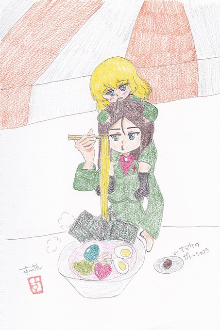 今日は めんの日 と聞きました。 あんこう祭りで渡来人さんのBC自由学園ラーメンを 食べているノンナとカチューシャ。