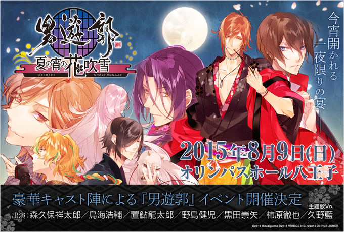 【イベント情報】8/9開催「男遊郭~夏の宵の花吹雪~」プレイガイド先行チケット6/17(水)より発売開始!<出演>森久保祥太郎、鳥海浩輔、置鮎龍太郎、野島健児、黒田崇矢、柿原徹也、久野藍 http://t.co/nepBKrMCE7