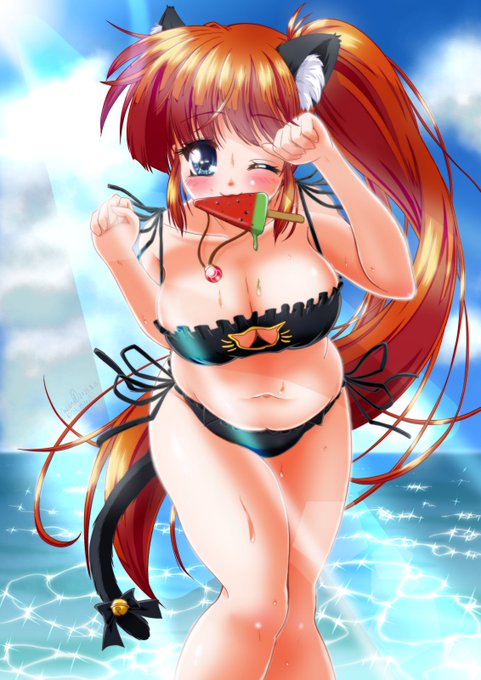 サンぽんさん( @san_pon )主催のリリカルスイカバーイラストです。スイカバーくわえたにゃんにゃんにゃのは♡スイカバー食べすぎ?おにゃかふにむに(੭ु ˃̶͈̀ ω ˂̶͈́)੭ु⁾⁾”♡♡