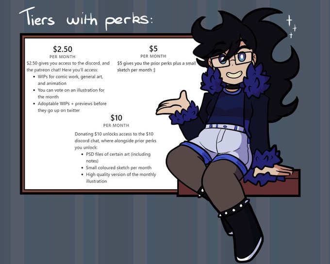 Never really made a full post about it, but I do have a P4tre0n for those who wanna support me- with extra perks such as monthly illustration voting, sketches, adoptable previews and more!
