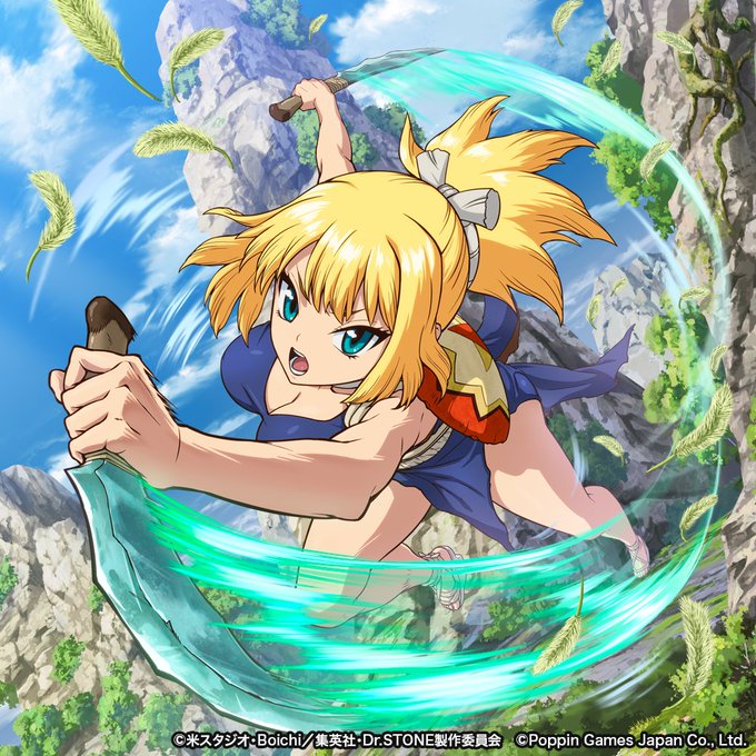 【キャラクター紹介:コハク】 金髪碧眼の少女。 軽い身のこなしと高い経験値で男にも引けを取らない武力の持ち主。 千空の生き様を気に入り、サルファ剤で姉のルリが病気を克服したのちも「科学王国」の仲間として千空に力を貸す。 #DrSTONE #バトルクラフト #バトクラ
