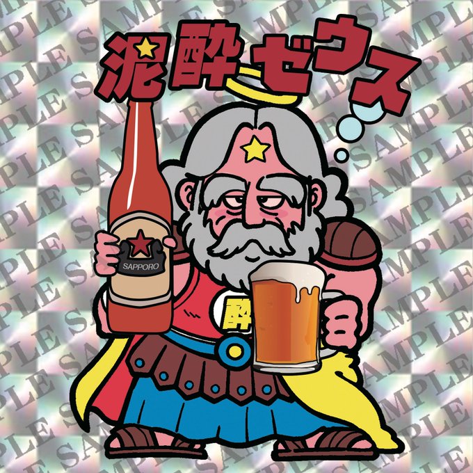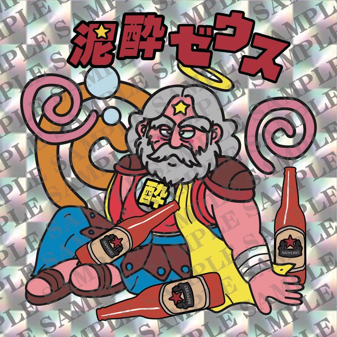 泥酔ゼウス(ラフ) 2パターン まだラフで雑なので時間みつけてキチンと作り直します😊 ARTシールとは別で、泥酔シリーズとして出していけたら🍺 コレは銀プリズムで出すつもりです✨ #ビックリマン #自作シール