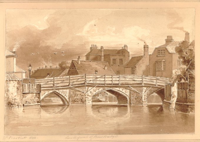 Bow Bridge, spanning the River Lea near #London on a tranquil day in 1832 - Dating back to the 11th Century - and known for its distinctive bow-shaped arches, this structure inspired the name for its surrounding neighbourhood