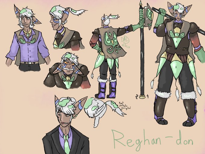 Reghan-don, a trielvpysis("ringed-ear elf") that inhabits the continent of Galicia. He is a knight/guard-for-hire who wanders the lands of Eire. At first he seems to have a more passive and relaxed demeanor but is very violent when stepped on, rumors say he killed past employers.