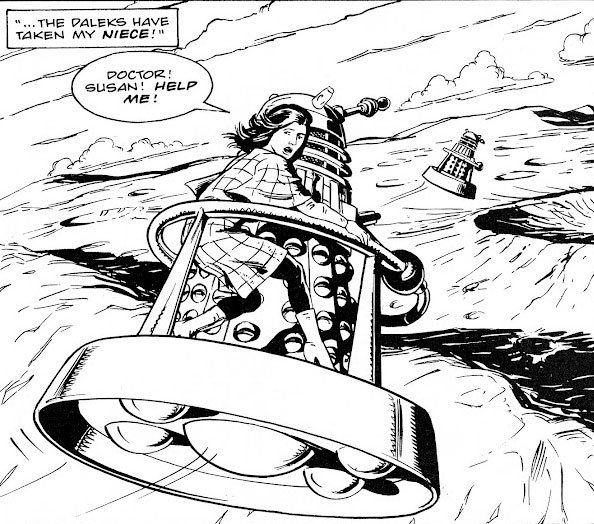 Richard Jenning's art from The Dalek Book (1964) is nicely echoed in Lee Sullivan's illustration for Daleks Versus the Martians (1996).