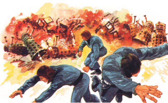 A group of Daleks are blown up in Terror Task Force. (Terry Nation's Dalek Annual, 1976, art by Edgar Hodges.)