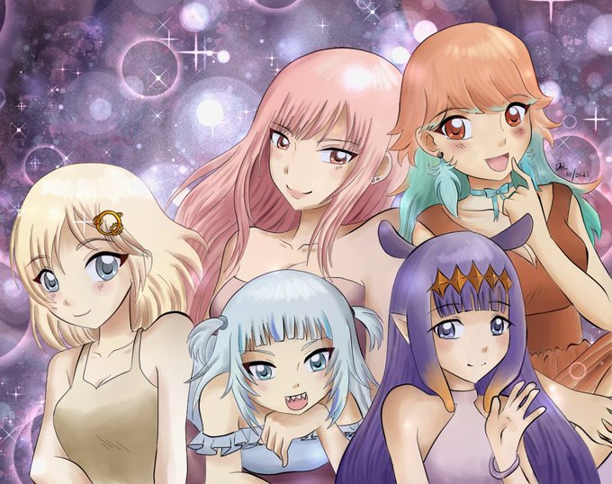 #HololiveEN myth girls illustration! In pretty dresses like one of those old Sailor Moon illustrations.