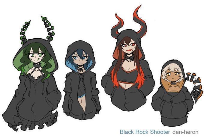 Have some quick doodles to get back to drawing, some matching outfits for the Black Rock Shooter team. Just a basic idea I have been playing with, will likely retouch their designs later on