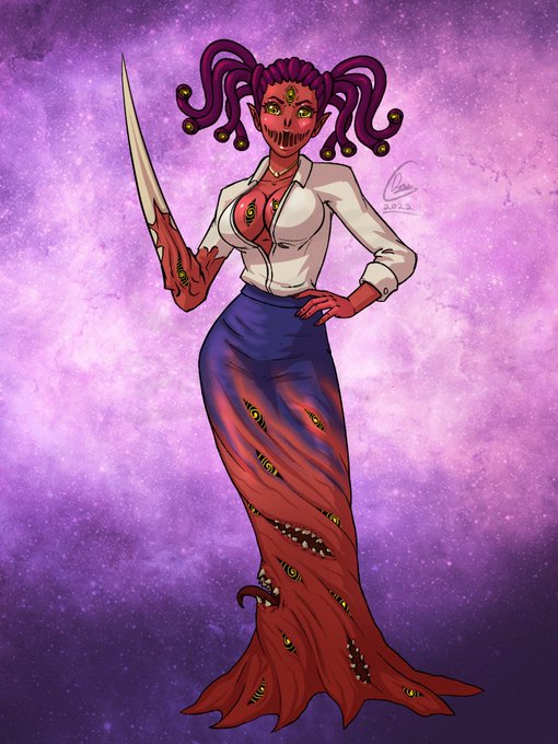 @lichelets Posting my eldritch horror flesh gal Bahsoma. And her costume, perfectly normal office lady. 🎃🎃🎃
