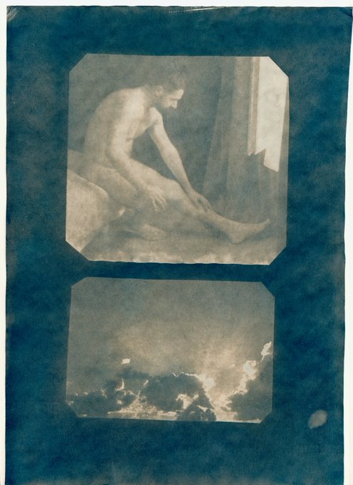 Nu masculin assis et coucher de soleil, #cyanotype d'après négatifs papier (prises de vue numérique et argentique), virage au tanin, 2018 (disponible) #malenude #alternativephotography