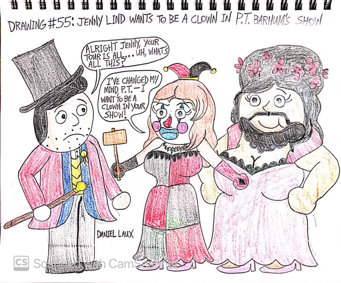 Drawing 55: Here we have a piece of @GreatestShowman fanart that depicts something I think would've been funny to see. Here we have Jenny Lind deciding that she'd rather be a clown in P.T. Barnum's circus show instead of her singing tour. I guess the Bearded Lady helped there!