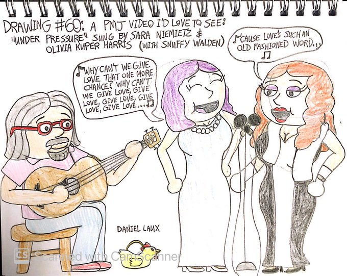 Drawing 60: Here is a drawing of a @PMJofficial I would love to see one day. It's of @SaraNiemietz & @olivia_k_harris doing a duet of "Under Pressure" by @QueenWillRock & @DavidBowieReal with @snuffywalden on guitar! (At the time I drew this, Sara had purple hair.)