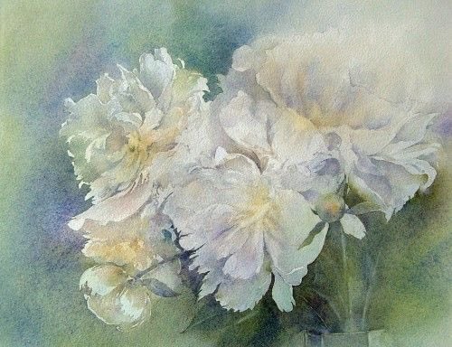 🌿Un vent bleu du soir Sur les pivoines blanches Parfum de la nuit Haïku (Aquarelle)