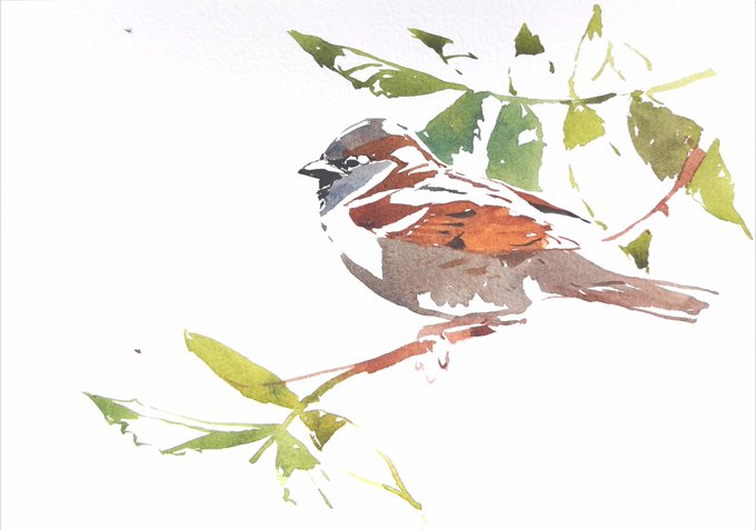 Male House Sparrow among Rowan, an Original Watercolour painted this morning, and available for sale as part of #artistsupportpledge, size 185 x 270mm and priced at £200 plus £8.50 P&p within UK. I can post abroad also. Please DM or message me 😁 @RSPBbirders @BirdGuides