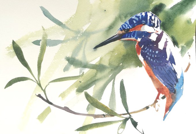 Male Kingfisher in strong Willow shadows, an Original Watercolour, painted in the field & available for sale as part of #artistsupportpledge size 180x 260mm and priced at £200 plus £8.50 P&p within UK. I can post abroad also. Please DM or message me 😁 @RSPBbirders @BirdGuides