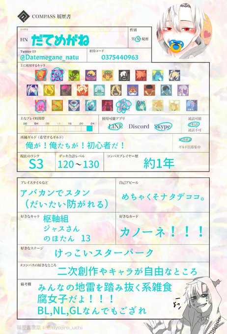 #コンパスお絵描き勢と繋がりたい #コンパス履歴書 履歴書通り雑食の腐女子です!大抵の地雷は踏み抜けます💥💥PSはゴミ野郎です💕固定誘ってください!! RT、♡も回ろうかと思います!