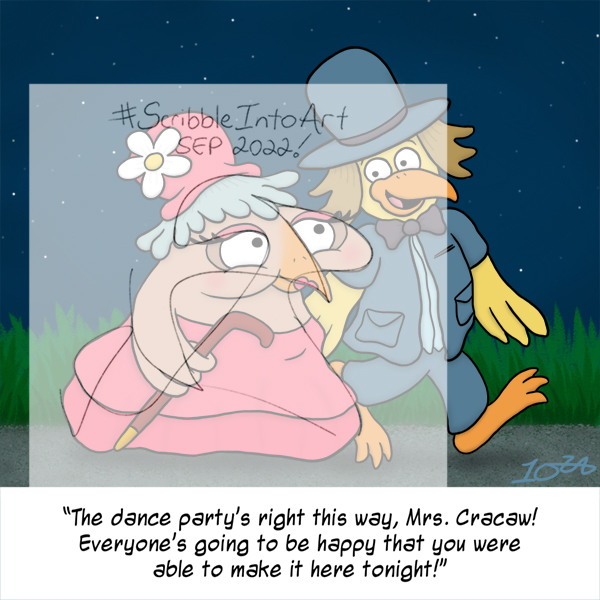 The September 2022 #ScribbleIntoArt is a bird woman being escorted to a dance party! #colour_collective #PrussianBlueAndSmoke