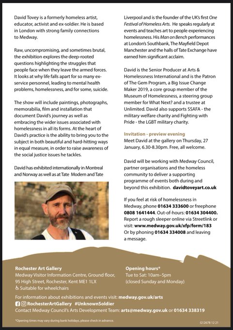 Join us for the exhibition preview of ‘The Unknown Soldier’ works by @DavidTovey1975 at Rochester Art Gallery