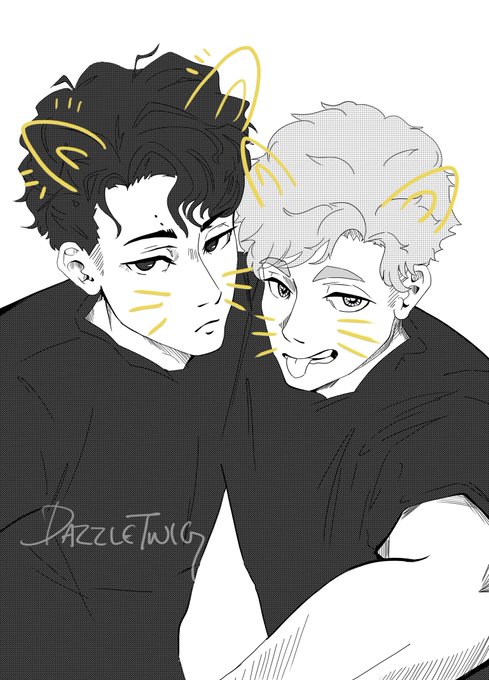 Experimenting with screentones. A rare Sakuatsu selfie! Don't think too hard about the username, I'm not about to start conspiring about susumuverse lore. But I did get permission from @catboyhokage so it's okay ...?
