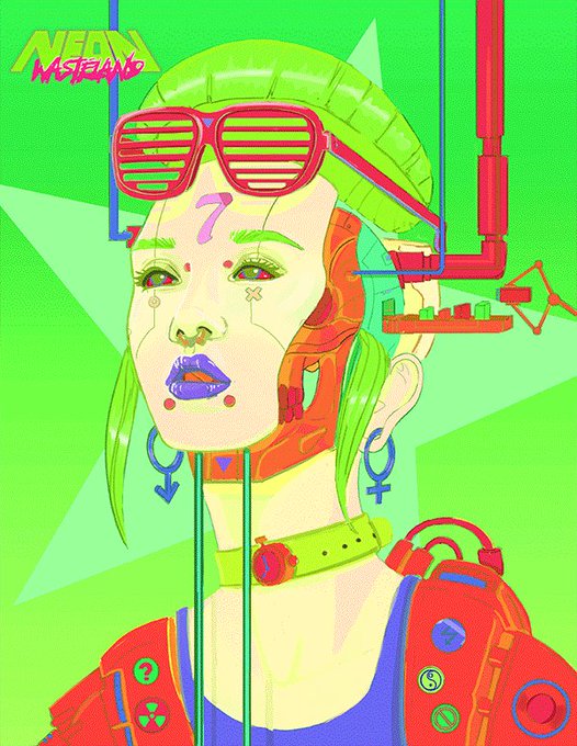 Byte Me. Part of my new "Face Off" portrait series more at https://t.co/z6cZLIoBuT #cyberpunk #drawing #vaporwave #future #neon #colorful