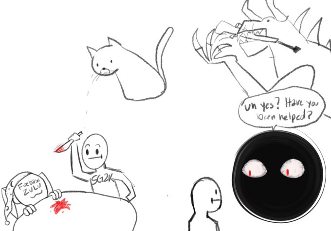 The drawing stream went…many places. We have @sealio4 getting eaten by @DeathclawAlpha. @KarrieWillow plotting to kill a man for his hat. A chihuahua in a suit, and then for @JimJones1978909, Bobby Bass being birthed into this world through Bad Mothafucka, Athena/Zeus style-